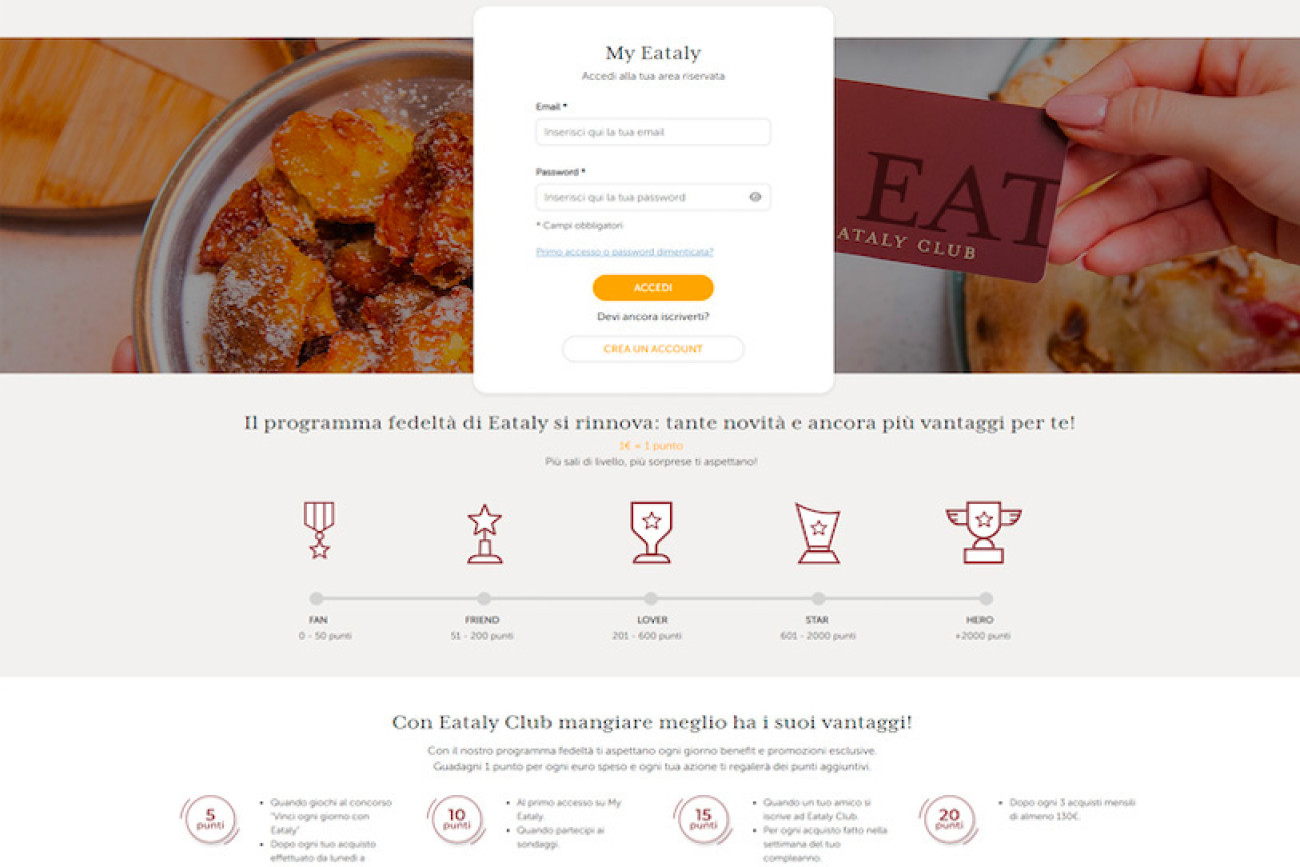 La collaborazione con Eataly è iniziata nel 2019 con la sfida di realizzare un programma fedeltà destinato a tutti i consumatori, rendendolo disponibile sia sui punti vendita che online nel rispetto della filosofia del brand, che include la possibilità di utilizzare il programma sia nell’ambito dell’acquisto dei prodotti, che dei ristoranti che dei corsi ed eventi proposti durante l’anno.