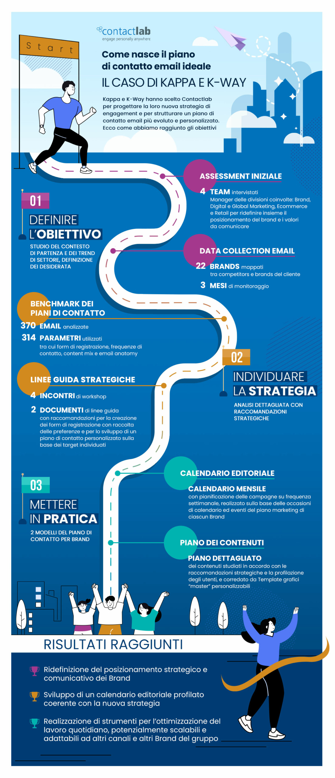 Nel 2023 Kappa e K-Way, importanti brand nel settore dell’abbigliamento, calzature e accessori per lo sport e per il tempo libero, hanno scelto Contactlab per progettare la loro nuova strategia digitale attraverso un’analisi di posizionamento competitivo nel settore e strutturare un piano di contatto più evoluto, grazie anche allo studio di contenuti più efficaci e personalizzati.