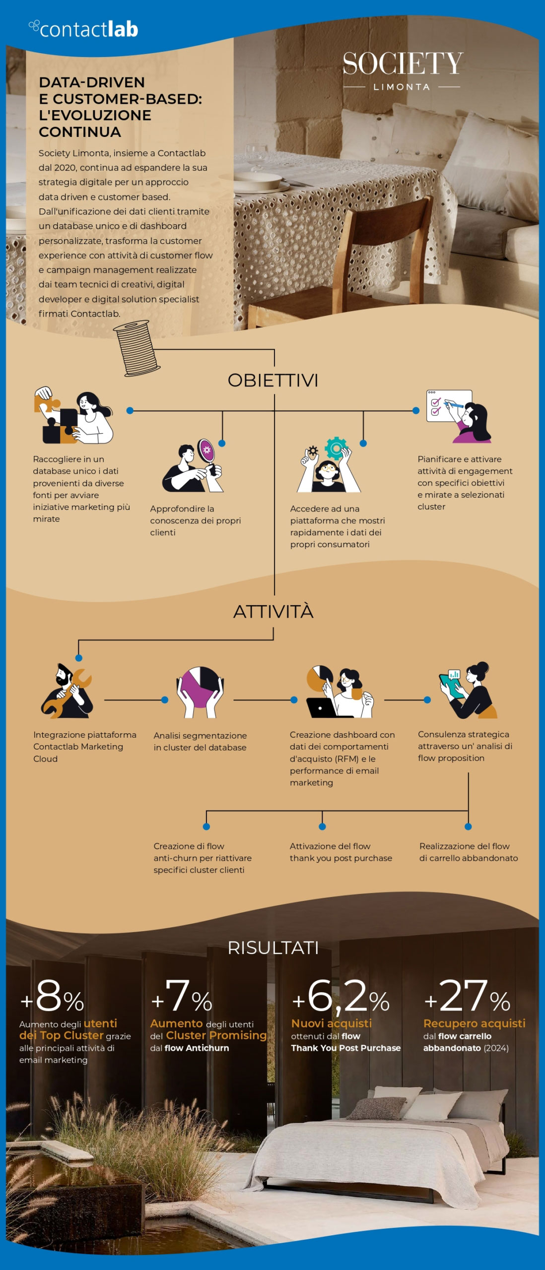 Society Limonta ha scelto Contactlab per implementare una Marketing Cloud in grado di integrare i dati provenienti da molteplici canali, così da evolvere la propria strategia e ottimizzare le attività di email marketing.
