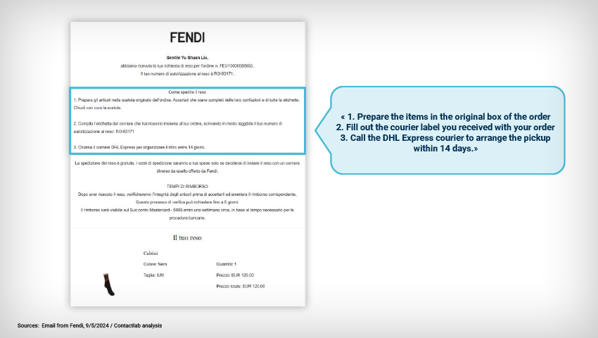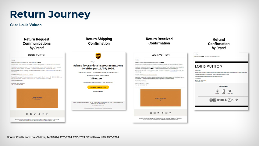 - In alcuni casi, le comunicazioni transazionali non sono complete di tutti i dettagli. Alcuni brand, però, risultano prestare molta attenzione a informazioni utili come le istruzioni per spedire il pacco, link per il tracking e indicazione dei tempi di attesa per il rimborso.